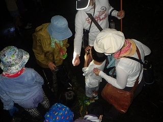 光り出すまでにはまだ少し時間があり、そこでベテラン指導員さん、やおらタモ網を出してかえるとザリガニを掬って生き物解説。子供たちを飽きさせません。