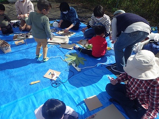 前日は終日雨が降り続いたので、地面の状況が心配でしたが、工作を始める頃にはアスファルト部分はすっかり渇き、楽しく工作ができました。