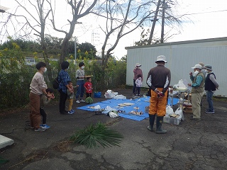 でんでんむし(イセノナミマイマイ、オオケマイマイ)、オニグルミの実、ヤマノイモのむかご、シュロの葉、ヤツデの葉、キンモクセイの香り、…など
