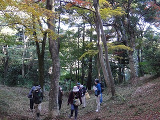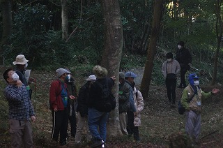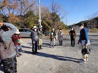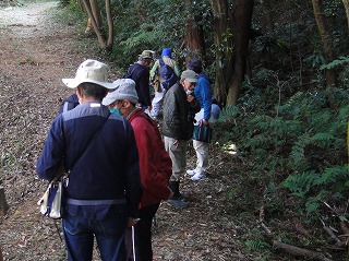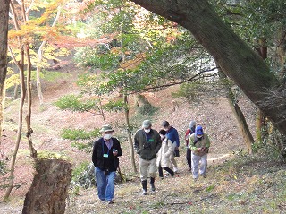 【左】開会挨拶   【中】虫探し先行隊   【右】紅葉谷登坂