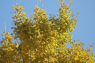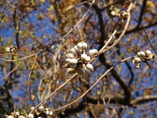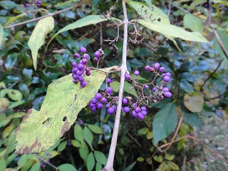 【左】イチョウ 黄葉   【中】コムラサキシキブ 果実  【右】ヤブニッケイ 虫こぶ