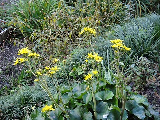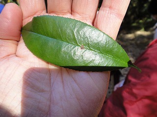 【左】鋸歯の見本(カナメモチの葉)   【中】カナメモチの果実   【右】ツワブキ 開花