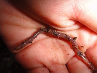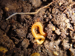 【左】ジムカデ   【中】ミミズの仲間   【右】地中から掘り出したコガネムシ類の幼虫
