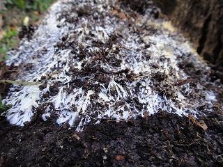 【左】朽ち木の菌糸   【中】コフキサルノコシカケ   【右】会員が持参した植木鉢に生えた「チャダイゴケ」