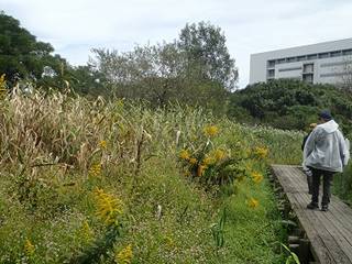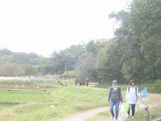 田んぼには稲穂がたれて実りを感じさせ、湿地帯にはセイタカアワダチソウの花やア シの実の群落が見られた。栗のイガやコナラの枯れ枝に大きなキノコが見られ、「実 り」の秋を楽しむことができた。