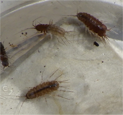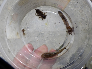 【左】チビクワガタ  【中】ヒゲジロハサミムシ 【右】ミズムシ(甲殻類)、ヤンマのヤゴ、ガガンボの幼虫、ヨシノボリ