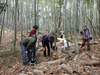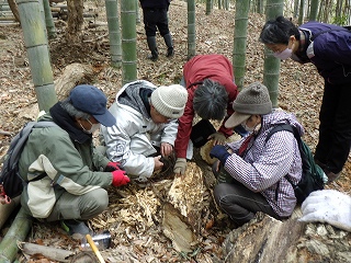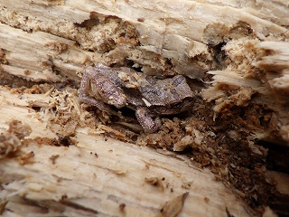 指導員の研修会と化し冬の生き物たちの様子を記録する会とした。雨が少なく木々は乾いていたが、湿り気の多いところに横たわる朽ち木の中に、アマガエルが冬眠していてびっくりした。