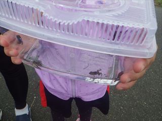 時間の経過とともに少し緩やかな流れになり、ベテラン指導員が川中に立った。これを合図に「自由参加の研修会」として進めた。一般参加者は川に入らず、もっぱら指導員が掬った生き物を水槽に入れ、ミニ水族館を開館。