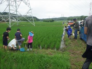 【右】増水中。子どもたちは田んぼのあぜ道でカエルをつかんでいた。指導員が"つかみ方"のコツを教えていた