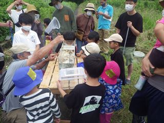 【左】田んぼのあぜで子どもたちがつかんだカエル  【右】生きもの説明中の全体の様子