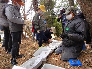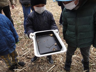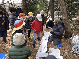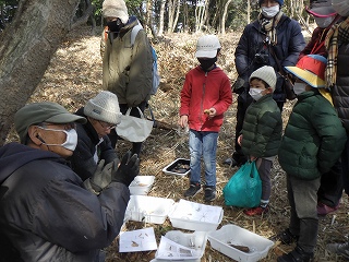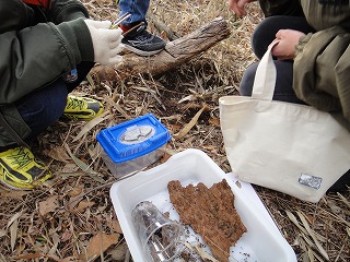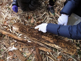 【左】朽ち木の中に小さな虫たち 【右】皆で見つけた生きもの、分かち合い