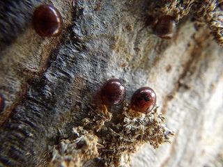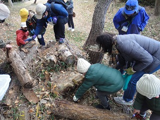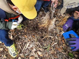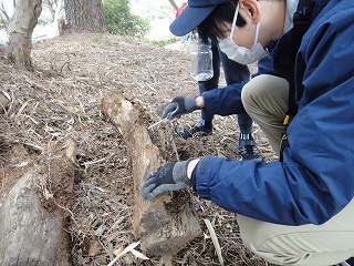 【左】伐採木の下の蟲探し 【中】落ち葉の下は蟲が少ない 【右】朽ち木の蟲探し