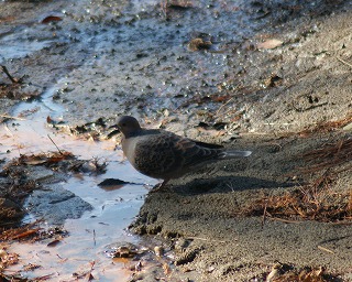【左】木陰の野鳥を探す      【右】大田大池は枯れ池状態、ハクセキレイ、キジバトがいた。