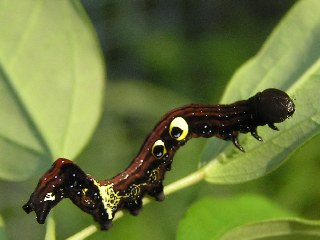 【左】奇妙な形をしたアケビコノハガの幼虫。