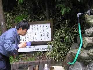 【左】西高倉神社近くのおいしい長命水を味わっています。
