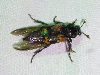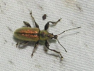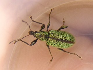 【右】美しい羽根をしたリンゴコフキゾウムシ。成虫がリンゴの仲間の葉を食べるそうです。