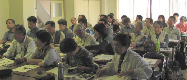 午前中は蒲池コミュニティーセンターで室内研修です。はじめに保護協会の開発法子さんから挨拶と海岸植物群落調査の意義について説明がありました。保護協会が中心になって編纂した植物群落レッドデータ・ブック(1996)を解析した結果、特に海岸の植物群落が危機的な状況にあることが明らかになったことが、全国規模の調査のきっかけだそうで、2003年度から取り組んでいるとのことでした。続いて千葉県立中央博物館の由良浩さんから「海岸植物群落の特徴―特に砂浜の環境と海岸植物群落の関係―」と題して講演がありました。海でも陸でもない海岸という特殊な環境と、そこに成立する植物群落について説明があり、最後に海岸植物群落が危機に瀕するに至った原因についても触れられました。