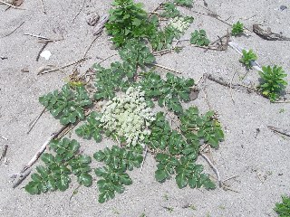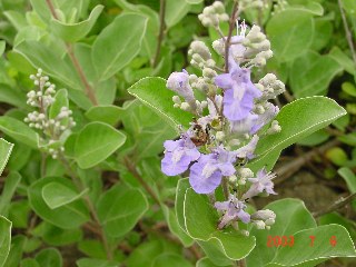 【左】地元の人たちが風砂防止用に育成しているトベラ、シャリンバイ、ハマヒサカキ、アオキです。