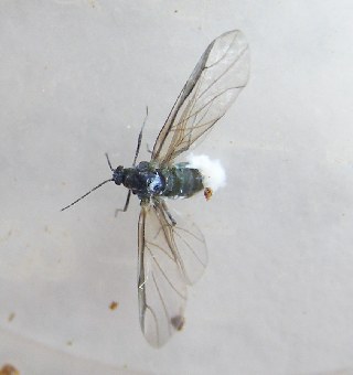 【右】ヌルデオオミミフシアブラムシの成虫。春から秋に掛けてヌルデに虫瘤(五倍子)を作り、冬はチョウチンゴケで越冬し、春にヌルデに戻る。