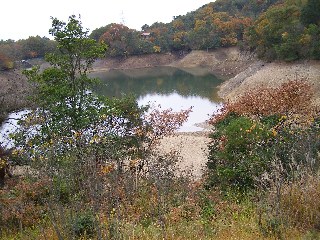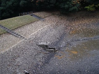 【左】水位が下がった筑水池。