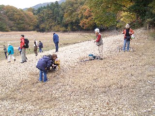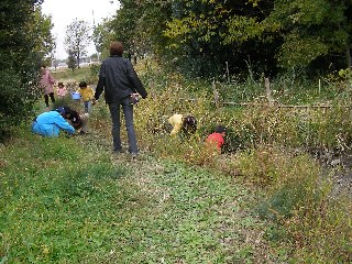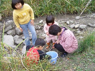 【中】早速、池に入って生き物を探しています。