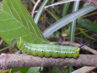 【右】クチナシに付いていたオオスカシバの幼虫。