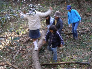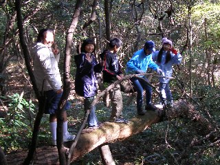 【左】浅井さんの指導で倒木の早渡りの競争です。