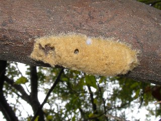 【右】ハラビロカマキリが東屋の柱に卵を産みました。
