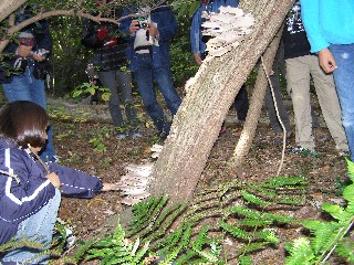 【左】カシノナガキクイムシの被害木を見ながら虫の生態についてお話を聞いています。