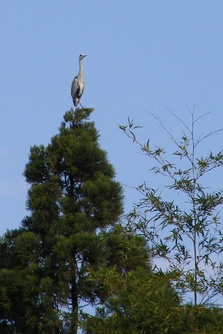 【右】アオサギが高いところから出迎えてくれました。