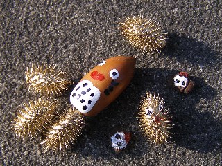 【中】浅井さんのプレゼント。オナモミ、カラスウリ、マテバシイの種子で作られたそうです。