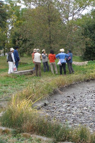 【左】筑水池の見どころをお話しています。