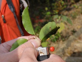 【中】ソヨゴの葉をライターであぶって見ました。いい音で弾けました。