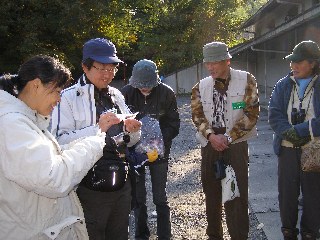 【右】雄花が赤いハンノキの説明を三輪さんから聞いています。