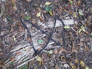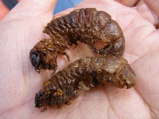 【中】樹木の粉砕した場所にカブトの幼虫ミイラがたくさん落ちていました。