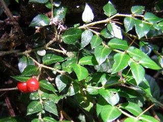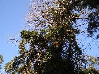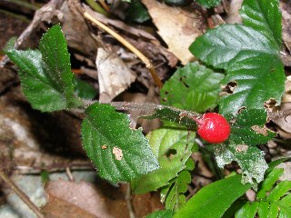 人知れずに立つ大木。周りでサルの鳴き声か? イズセンリョウ(ヤブコウジ科)実にシカが食べない毒(メサキノン)がある。白い実は花から1年かかってできる。ハクサンボク(スイカズラ科)南方系。タツナミソウ(シソ科)招き猫のよう。キンポウゲ(キンポウゲ科)ウマノアシガタか?