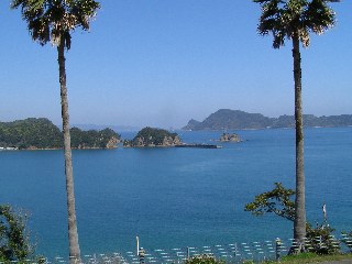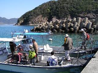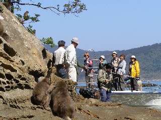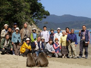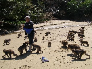 京大の研究所の研究員の案内をずっとしてきたという90歳過ぎの三戸サツヱさんに案内していただく。浜から数分船に乗ると幸島に着く。島ではサルに目を合わさないように、えさをやらないようにと注意を受け、上陸。仲むつまじくのみ取りするものや、小さい小さい小猿も目にする。サルに負けじと島の斜面を登っているのは南川さんとりん?登り切って“お山の大将“になったのは、勇気!サルも顔負け???