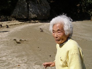 【左】富土の巨大アコウ。 【右】幸島のお婆ちゃん(三戸サツヱさん)と記念写真。