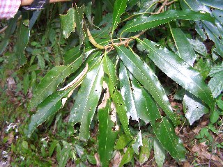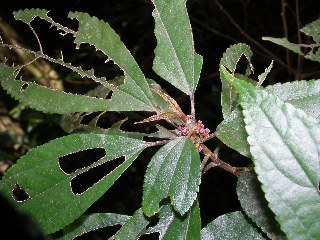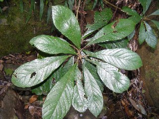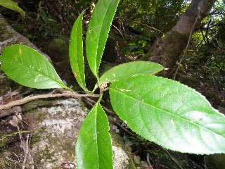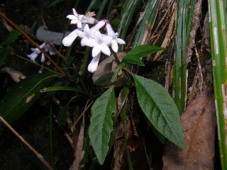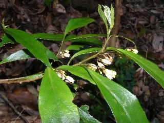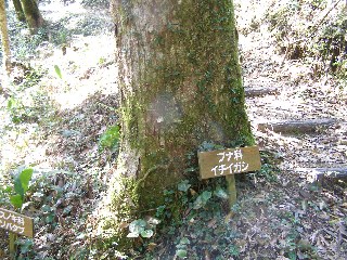 谷の奥まったところから斜面を登っていく。サツマイナモリソウの花が迎えてくれた。冬に咲くアカネ科の花だ。イワタバコ(イワタバコ科)湿った岩にたくさん張り付いていた。大きいのはたばこに似た葉、若葉は山菜。カンアオイ(ウマノスズクサ科)愛知のものとはちがうらしい。花は土に埋まって咲いていた。カンザブロウノキ(ハイノキ科)日陰に強く成長遅い。ヤマミョウガ、ヤブミョウガと似る。コバンモチ(ホルトノキ科)はが丸っこく輪生。キミズ(イラクサ科)葉枝ほとんどなし、枝にくっついて実が付く感じ。ツルコウジ(ヤブコウジ科)茎に毛。チシャノキ(ムラサキ科)カキノキダマシとも。若葉の味がチシャに似る。ヤマアイ(トウダイグサ科)染料にはならない。