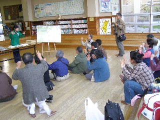 【右】三戸サツヱさん(94歳)にサルの生態についてお話を聞きました。