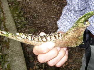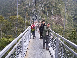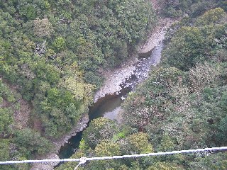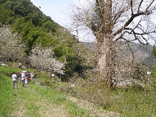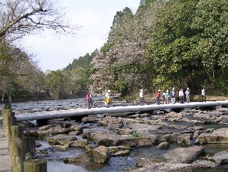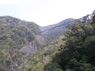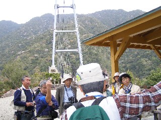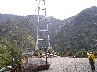 自然の家から1時間半ほどバスにゆられる。焼酎工場を横目に見ながら到着すると、ちょっと前まで日本一のつり橋だったという大きなつり橋が目に入った、下を見ると足が震えると言った高所恐怖症は誰?つばを落として高さをたしかめていたのはだあれ?一つ奥の谷筋より奥は大きな照葉樹林帯ということだったが、手前の方は戦争前後で切り出したということで雑木林のようになっていた。山桜が所々で満開だった。中に入っていくと、木を運び出したトロッコの跡がみられた。