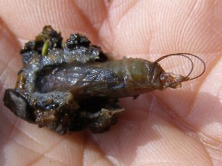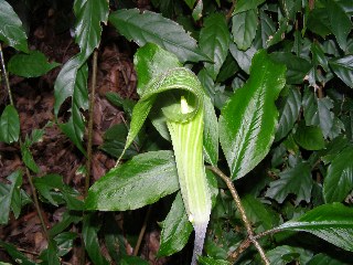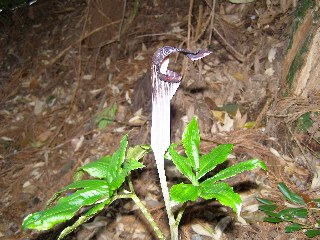 ボラ土の場所もあり、川岸にはひきがえる?のオタマジャクシがびっしり。ゲンジボタルとヘイケボタルの両方出るところがあって、時期になると、パトロールに村井さんが出かけるとか。(家から15分くらい)とにかく真っ暗で、がざりと音がするとものすごく怖いとのこと。この間の音は、鹿だったかも・・・?だって。あたりには鹿の糞だらけ!おまけにシカにくっついている“ヤマビル”もまき散らされて、以前は考えもしなかったヤマビル対策をしないと夏は山に入れないのだそうな。糞に憤慨してるのは、だあれ?キジョランに謎の芋虫発見。テンナンショウの群落も発見!花が一斉に同じ方向を向かず、てんでばらばら。なんだか1年生の子どもたちみたい!