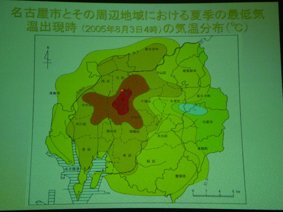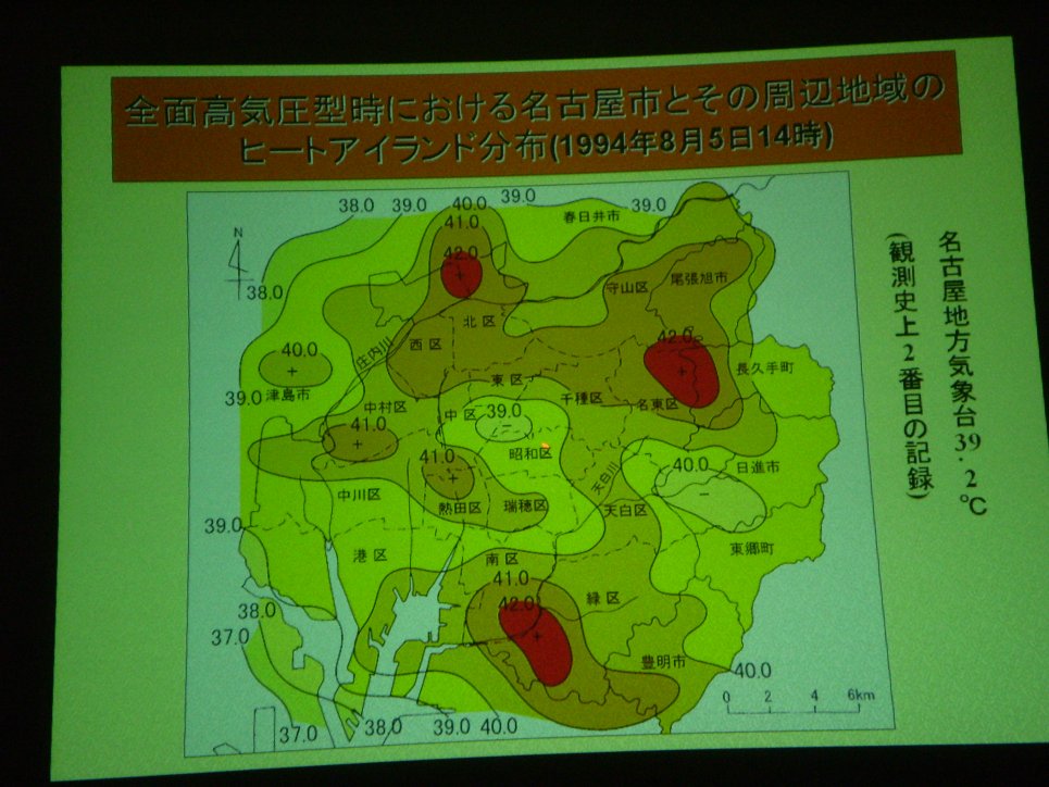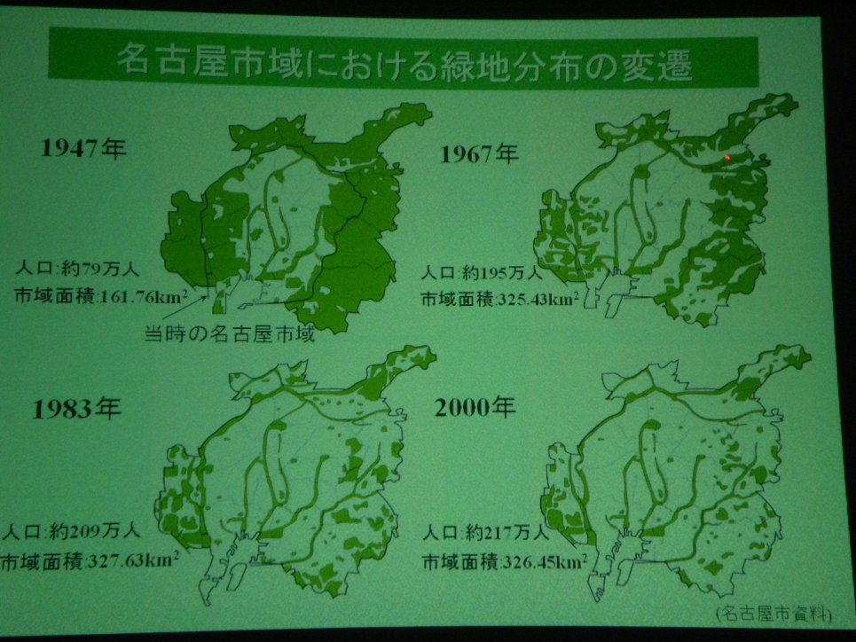 ・ エアコンの冷房排熱や建築物の構造変更・アスファルトやコンクリートの畜熱などで誘発されるヒートアイランド現象は緑被率(緑化率)と大いに相関関係があり、30%の比率で温度差4℃以下に押えられる言われています。現在、名古屋のその比率は24.5%。これからどう変化していくのでしょうか。
