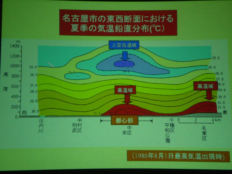 ・ この様な夏場の南高北低型現象で35℃以上の高温・高湿・高濃度の中区・熱田の熱気が長久手や東部丘陵に向けられ、天白川の水で冷されている瑞穂・天白は24℃と涼しい。