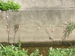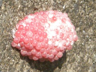 【左】コンクリート壁に産卵されたスクミリンゴガイの卵塊