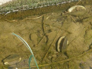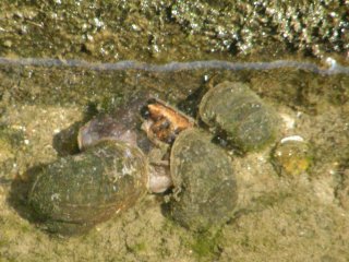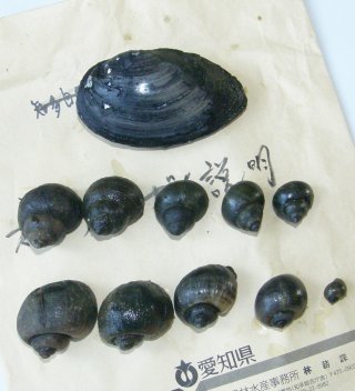【右】上からドブガイ、タニシ、スクミリンゴガイ