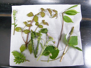 【左】山菜料理の材料。ワサビ、タラ、コゴミ(クサソテツ)スギナ、ツクシ、コシアブラ、ミツバ、フキ、ハルジョオン