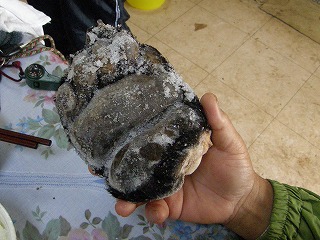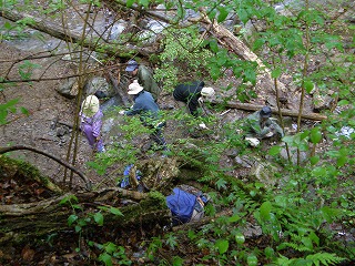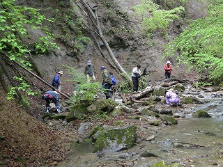 6時。それぞれ車に乗り込んで、村上さんの案内で化石掘り。(本当なら昨日の予定)雨で増水した川を上って石たたき。さすが桑原さんの石をたたく姿には迫力と職人気質を感じた。一番収穫のあったのは根性の牧野さんと、石をたたかなかった永田さん。(他にもいたかもしれませんが・・)永田さんの眼力はやはり海岸で磨かれたもの??せっかく掃いていったながくつの中に水を入れてトホホだったのはだれ?