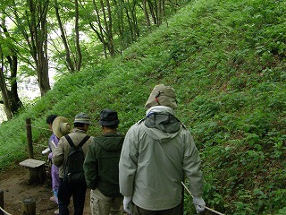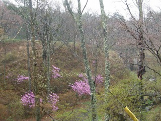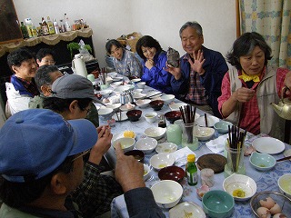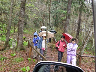 なんだかおなかがすいてきたと、時計を見ると1時。村上さんの案内でそばの城で昼食。その後、コスモスの湯で風呂に入り早々に下条YHにはいる。もうできあがっているのはだれ?とにかく雨、あめ、アメ、ame。どうしようもない。宿ではさっそく宴会。村上さんがドイツビールの差し入れをしてくれた。夕方やっと雨が小降りになったので周りの森を散策。「謎の植物がある」というので、みんな勇んで行ったらふきのとうの開いた物でしたとさ。