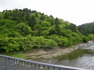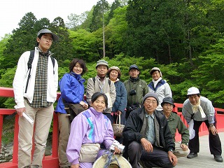 だんだんみぞれも雨もやんできて、愛知県境を越えると道路まで乾いてきた。予定通りの時間に到着しておにぎりをほおばる。おにぎりの中の梅干しはもちろん自家製。  豊田市の小学校にお勤めの岡田先生。物静かで尋ねたことには誠実に答えてくださった。飯森山の斜面、香嵐渓周りを歩きながら次から次へと植物の名前が出てくる。また、巴川水系では・・・とかどこそこあたりではというお話もあり、よく歩き回って調べておられるのだなと感じた。ほかにも香嵐渓の植物も木が育ちすぎて日陰になってしまい、シダ類が茂ってきて今まで見られたものが減ってきているということがある。保全には木の枝を少し払ってやる必要があるという話。足助町でも、今までよく見られたものが盗掘によってや、田畑が荒れることによって植物の数が激減してきている物もある。という話が印象に残った。川の横に立つ杉の木には特定の物に下から上までまんべんなく傷の付いている物があった。ムササビが移動のために飛びつくのに使っている木だとのこと。どうも太さや場所で気に入る物があるらしいとのこと。3時過ぎに橋の上で記念写真を撮り帰路につく。車が動き出すまで見送ってくださる岡田先生にその人柄を感じながら香嵐渓をあとにした。